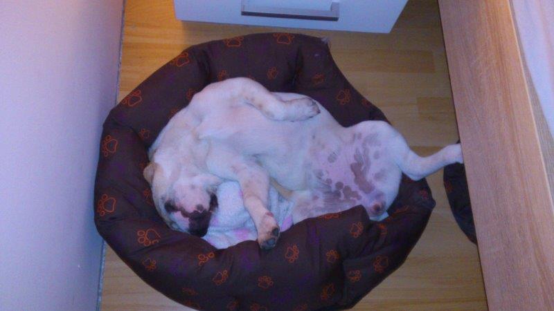 Leni liebt ihre Schlafstätte, und schläft am liebsten am Rücken, das sie dabei recht laut schnarcht macht sie nur noch liebenswürdiger. Leni's zweitliebster Platz ist ein Kindersessel, diesen hat unsere Tochter an Leni "vermacht". Sie genießt die erhöhte Liegeposition, rollt sich ein, legt ihre Schnauze auf die Armlehne und entschlummert sanft für die nächsten Stunden.