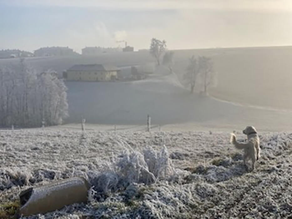 Ich wollte Ihnen schon längst schreiben. Uns geht es gut. Leo entwickelt sich prächtig. ER will einfach gefallen, das merkt man. Ich sende Ihnen ein paar Fotos. Er liebt Suchspiele, liebt es am Meisten wenn er frei herum laufen kann. Am Foto sehen sie Leo vor seinem neuen HOF- Zuhause. Er folgt aufs Wort, er geht