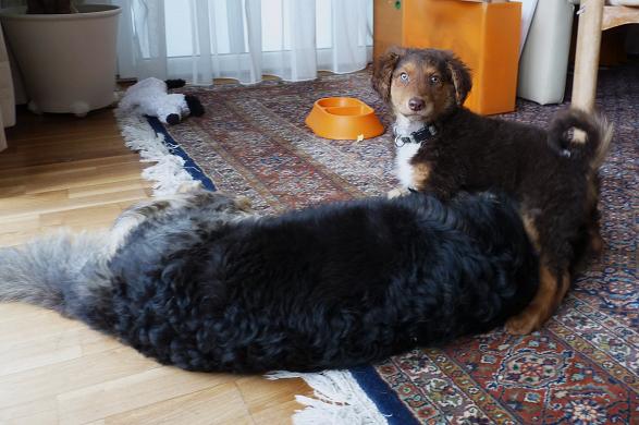 wir haben viel Freude mit Leo, er  entwickelt sich bestens, er schläft nachts bereits durch, ohne raus zu müssen,  spielt gerne mit Menschen und Hundeadoptivmutter Mira.