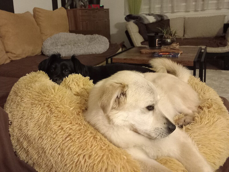 Lucky ist der absolute Traumhund. Er hat wirklich alles gelernt und macht es auch egal was man möchte. Mit Vicky hat er sich sofort verstanden haben in der ersten Nacht schon zusammen im Bett geschlafen.
