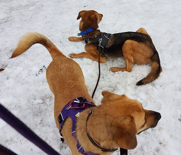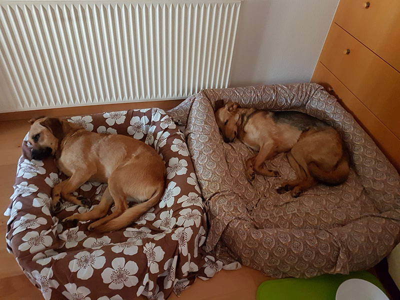 vielen Dank für diese beiden wundervollen Hunde! Das Leben mit ihnen ist eine wahre Bereicherung! Fanni ist sehr anhänglich und am liebsten immer mit dabei, Lucky beobachtet gerne und viel von seine geliebten Box aus. Er genießt unsere Spaziergänge im Wald.