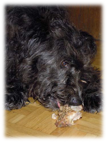 Gleich am ersten Abend habe ich mir die Knochen vom Schweinebraten aus der Küche geholt, davon war mein Frauchen nicht begeistert, aber behalten durfte ich es trotzdem.