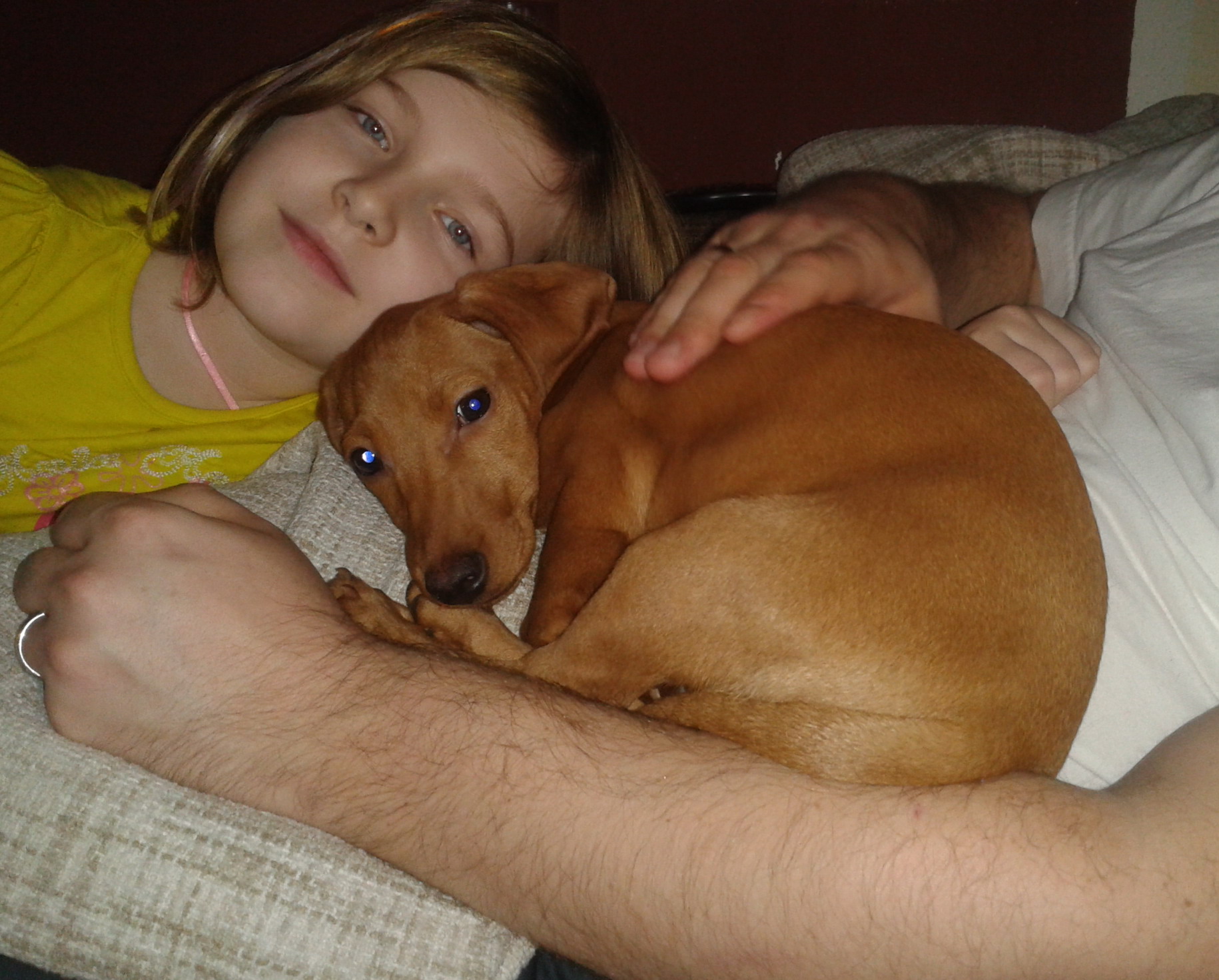 danke für das Foto! Luna hat sich sehr gut eingewöhnt, wir hatten am Anfang etwas Probleme mit einer kleinen Erkältung die durch das Wetter zur Zeit etwas hartnäckig war. Tja was soll ich sagen: sie ist sehr liebesbedürftig (eine kleine Kuschelmaus), sehr verspielt und hat  bereits ihren Platz auf der Coach für sich beansprucht. Sie ist sehr wissbegierig, sehr aufgeweckt und lernt total schnell! Unsere Spaziergänge werden auch  schon immer länger, wenn es das Wetter zulässt, da ihr sehr schnell kalt wird. Sie dürfte mehr von der Mama mitbekommen haben, da sie bereits Größer als ein Dackel ist und sie liebt es zu springen und herumzutollen. Momentan liegt sie auf meinem Schoss und versucht zu schlafen (ist nicht mehr so leicht, da der Platz schon etwas klein wird...).
