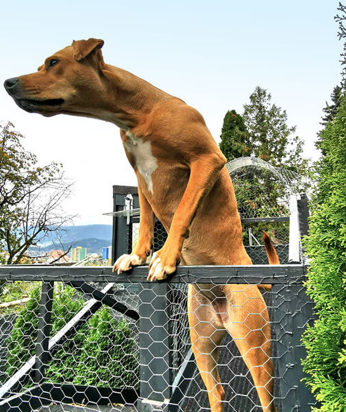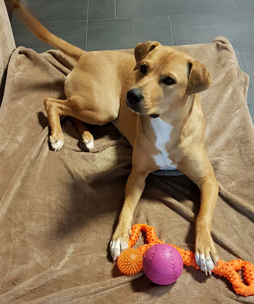 Mit der Hündin Poppy (ebenfalls von animal care) im angrenzenden Garten hat Luna auch eine sportliche Spielgefährtin gefunden.
