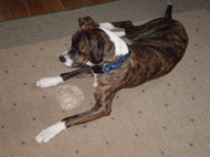 Ich glaube sie fühlt sich sehr wohl bei uns. Sie läuft und hüpft mit Ronja im Schnee durch den Garten, spielt ganz gerne mit ihrem Quietschteddybären und hält nach einer gemütlichen Schmusestunde ein Schläfchen im Körbchen oder auf der warmen Ofenbank.Die Tibi-Katze hat sie auch schon beschnuppert und auch das Pony hinter dem Zaun. Makra ist zu allen lieb und freundlich. Die Spaziergänge liebt sie sehr .Unsere Ronja (11 Jahre) ist nun auch wieder viel lustiger.Sie ist sehr stolz auf ihr großes " Baby" ! Wir sind sehr froh, dass wir Makra haben.