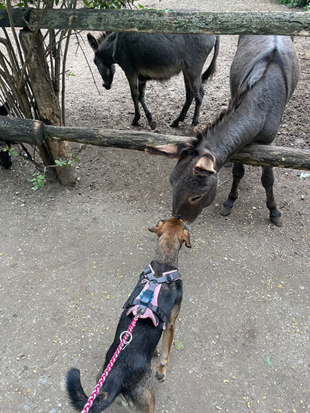 Am liebsten geht sie mit mir in den Stall zu meinem Pferd, um dort mit den anderen Hunden zu spielen.
