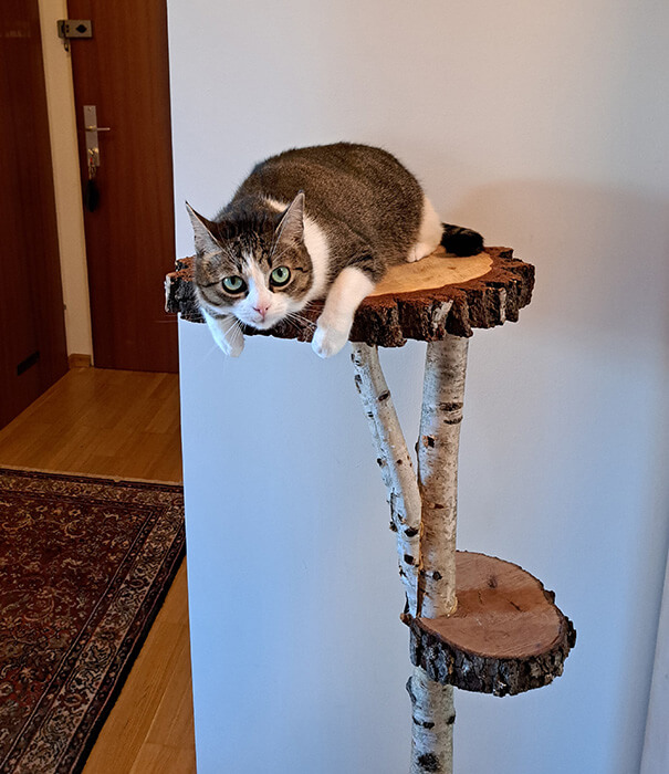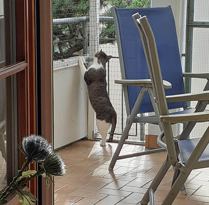 Ich habe auch eine Zweitwohnung in Klagenfurt im Grünen. Gott sei Dank funktioniert das Reisen im Auto sehr gut mit Manka. Sie ist sehr brav beim Autofahren. Sie schläft zwar nicht, aber sie liegt ruhig in der Transportbox und fragt erst gegen Ende der langen Fahrt von Zeit zu Zeit nach, ob wir wohl bald ankommen. In Klagenfurt angekommen, wird sie mit einer katzengesicherten Terrasse belohnt, wo sie Tag und Nacht die Vögel und Insekten beobachten kann. Und sie hat so viele Fans dort. Gleich nach unserer Ankunft kommen einige liebe Nachbarn vorbei, um den Superstar Manka zu begrüßen.