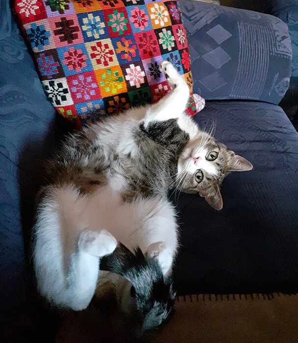 Ich wollte wieder eine Kätzin haben, eher jung, aber kein Baby. So gern hätte ich mir in den umliegenden Tierschutzheimen ein Kätzchen nach meinem Geschmack ausgesucht, doch es war Coronazeit und die Tierschutzheime waren für die Öffentlichkeit geschlossen. So musste ich – nicht sehr gern – im Internet suchen. Zuerst war ich fast verzweifelt, denn die meisten angebotenen Katzen schienen in Rumänien oder in der Ukraine zu sein, sie brauchten Freigang oder wurden nur zu zweit oder dritt vergeben. Doch plötzlich, genau am Geburtstag meines verstorbenen Mannes, sah ich das Foto der ca. dreijährigen Manka auf der Internetseite von Animal Care und verliebte mich in Sekundenschnelle in das süße Gesichtchen. Und wie die Beschreibung passte! Manka wurde als ängstlich beschrieben, wollte keinen Freigang, suchte ein ruhiges Zuhause ohne andere Tiere und ohne Kinder. Das war doch alles ideal und ich rief sofort an.