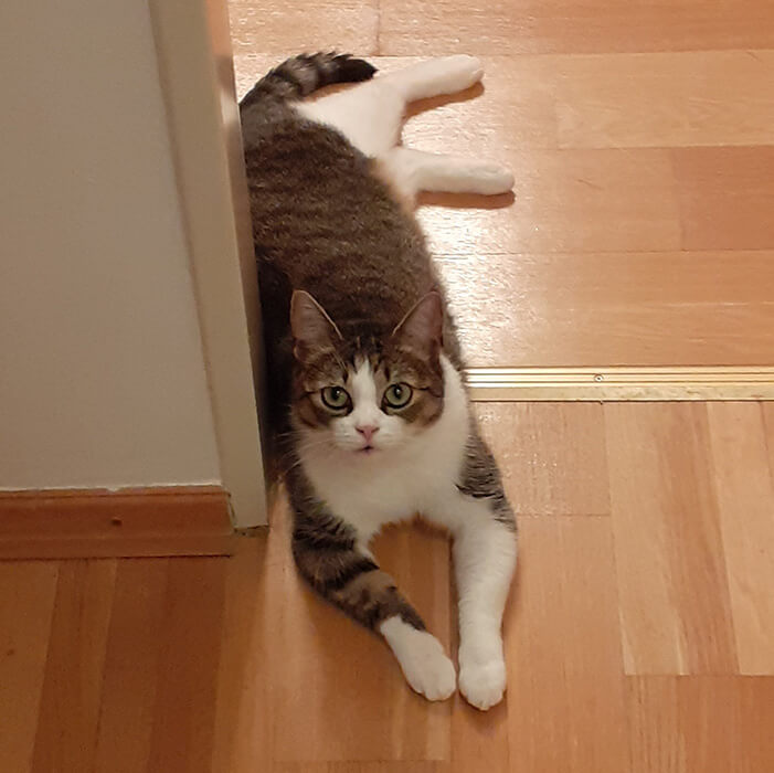 Ängstlich wie sie war, sauste Manka in Blitzesschnelle von einem Versteck ins andere, bis sie sich hinter einer Couch im Gästezimmer versteckte. Dort zwängte sie sich in einen Raum von ca. 20x20cm, ich weiß nicht wie. Wir zogen die Couch ganz vorsichtig etwas vor, um Manka nicht zu verletzen. Dort blieb sie ca. 30 Stunden lang und pfauchte mich an, wenn ich näher kam. Während ich schlief, wurde aber die Futterschüssel in der Küche leer und das „Kisterl“ im Bad voll….