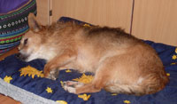 Hatte Mica sicherheitshalber mit im Schlafzimmer (was weiss ich, was die Bande treibt, wenn ich nicht zuschauen kann) bei den 3 Miezen, die sonst auch immer bei mir im Bett schlafen, getrennt von den lästigen Buben. Tja, und da hat Mica mit Genuß das Katzenfutter verputzt ... und schaut ihr Hundefutter nicht an. Aber Leckerli nimmt sie natürlich schon gern und das aus der Hand.