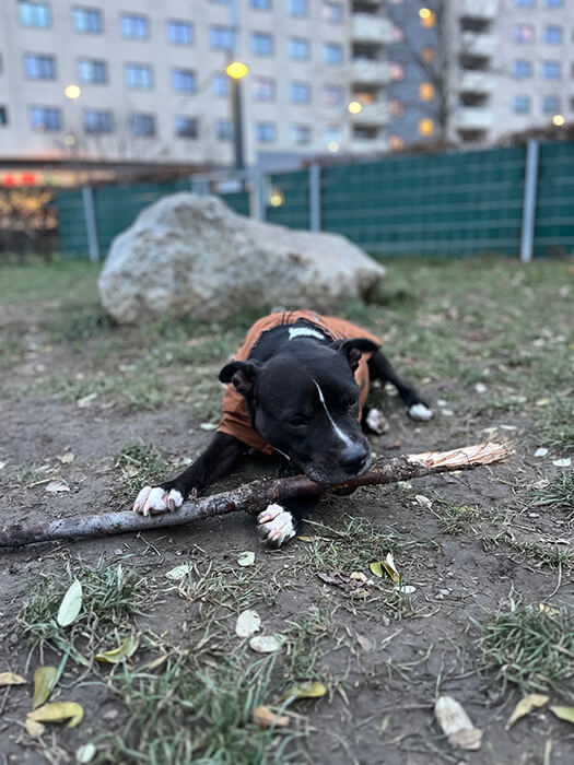 Er begleitet mich in Cafes und Restaurants und ich bin immer wieder begeistert, wie er solche Situationen mit Bravur meistert. Mikey ist sehr verschmust und es gibt ganz viele Kuscheleinheiten – vor allem am Abend, vor dem Schlafen gehen. Mit anderen Hunden versteht er sich blendend und zeigt sich im Umgang mit diesen souverän. Er liebt es, mit im Auto zu fahren – auch wenn er da unbedingt sein Kauspielzeug braucht, da sonst das Innenleben des Autos dran glauben muss *haha*