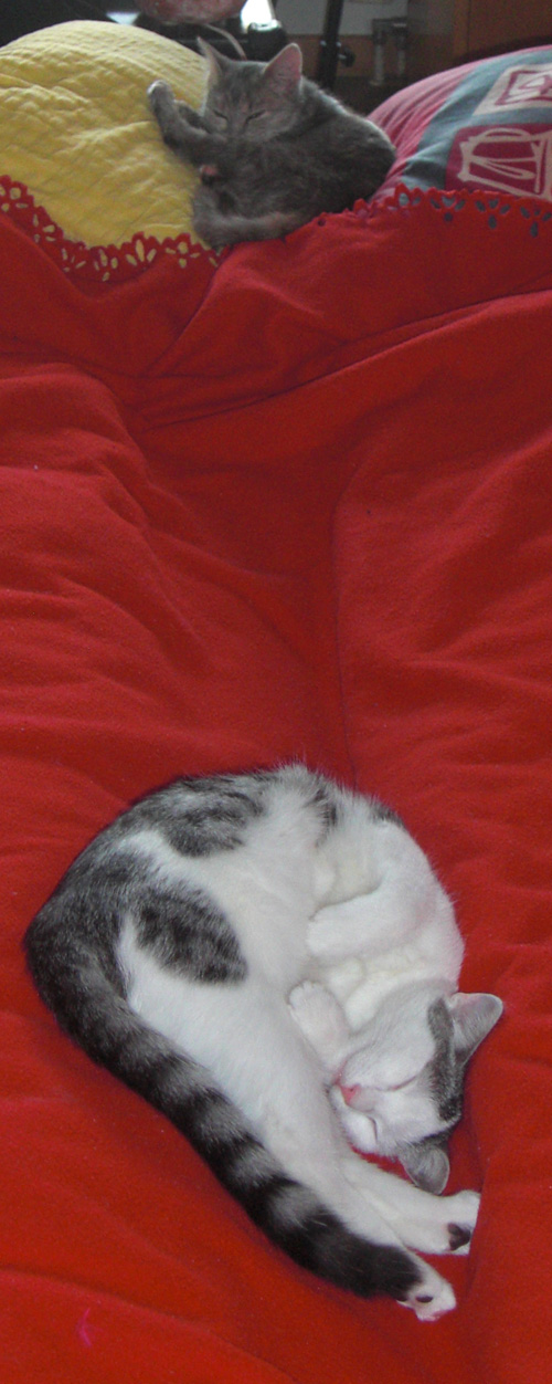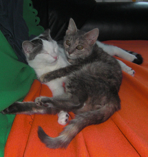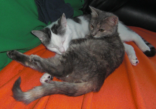 Die beiden verstehen sich mittlerweile richtig gut. Sie schlafen neben einander, fressen aus dem gleichen Napf und spielen auch schon richtig toll. Sprich sie fetzen durch die ganze Wohnung und räumen alles ab. Richtig süß.