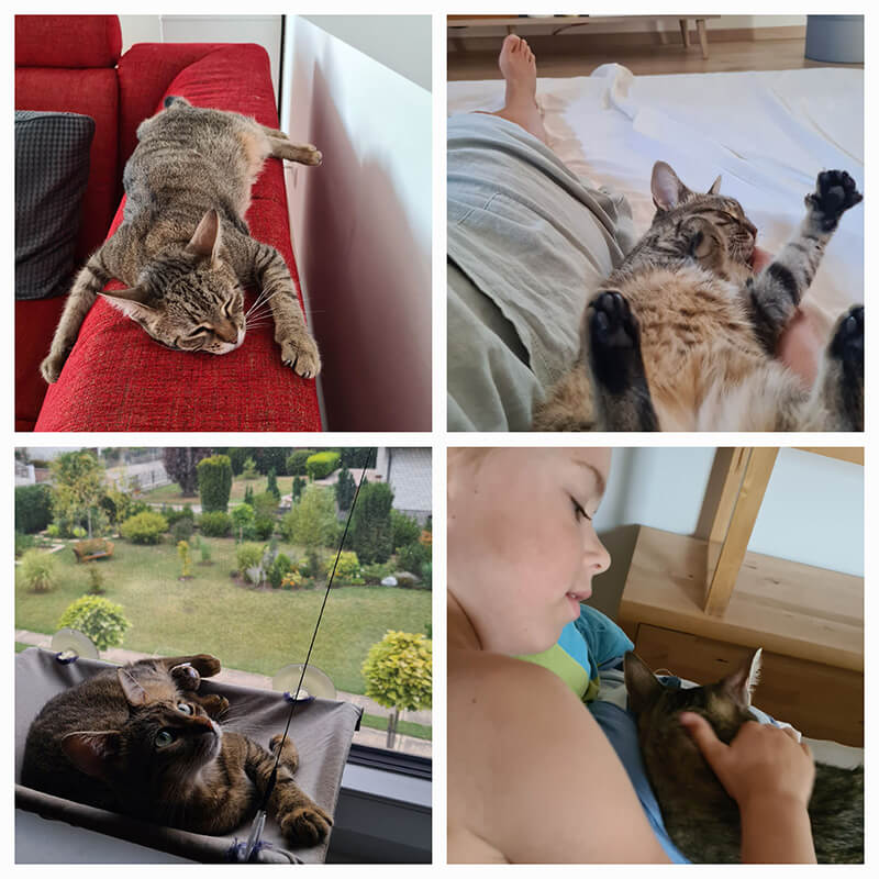 Sie erkundet das ganze Haus, hat schon ihre Lieblingsplätze, frisst gut und kuschelt sehr viel. In der Nacht kommt sie sogar zu uns ins Familienbett.