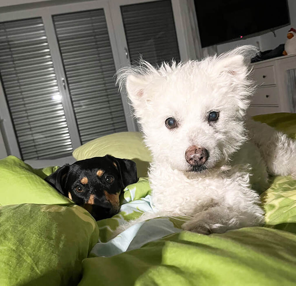 Mimi hat sich zu einem 100%igen Verlasshund entwickelt, welcher absolut immer abrufbar ist, selbst wenn ihr Wild vor der Nase wegläuft. Und nicht nur, dass sie auch zu Gretls bester Freundin geworden ist: sie kuscheln, spielen, schlecken sich ab, wälzen sich zusammen in Dreck und teilen ihr Futter. Man darf nicht vergessen, dass Gretl mittlerweile 12 Jahre alt ist und solche Sachen, bevor wir Mimi hatten, absolut nie gemacht hat, sie war immer eher ein emotionaler Brocken.