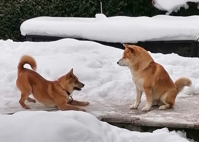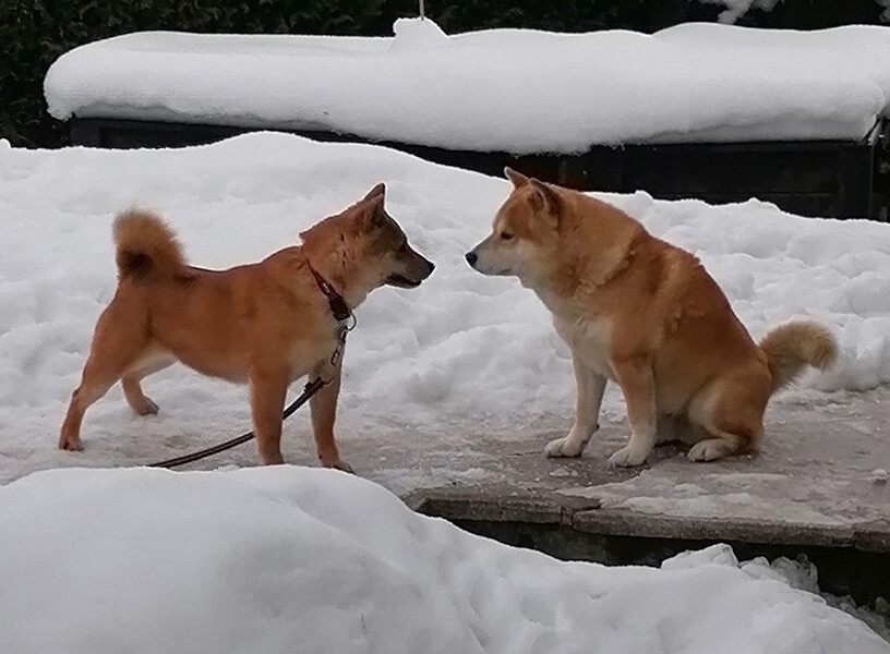 Die beiden verstehen sich schon ganz gut, Mina orientiert sich sehr an Yukio (vor allem im Garten). Yukio ist noch etwas skeptisch, aber überhaupt nicht aggressiv, wenns ihm zuviel wird, geht er weg!!
