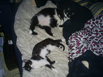 Wie man auf den Fotos erkennen kann, liegen beide gemütlich in meinen Bett (gnädigerweise erlauben die beiden mir, dass ich mich auch ins Bettchen legen darf - hahaha)