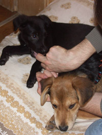 Bei den Übungsstunden mit Lucy (Sitz, Platz usw.) macht Miss Piggy auch mit: Sie schaut was Lucy macht und macht es dann auch (ungefähr) so. Sie ist ein süßes, extrem verschrecktes Hundemädel, aber absolut liebenswert. Sie braucht halt noch ein wenig Zeit, bis sie Vertrauen gewinnt, bis sie weiß, dass ihr hier nichts Böses passieren wird.