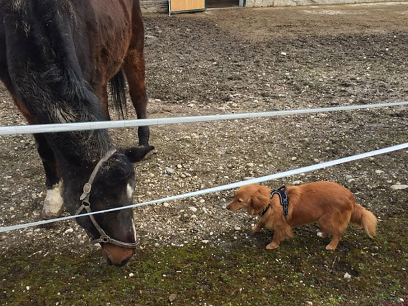 Unsere kleine Maus geht offen und freudig auf Mensch und Tier zu, sie hat sogar schon unsere Pferde in Oberösterreich kennengelernt, aber auch mit Kühen, Ziegen, Hennen und Katzen hat sie kein Problem.