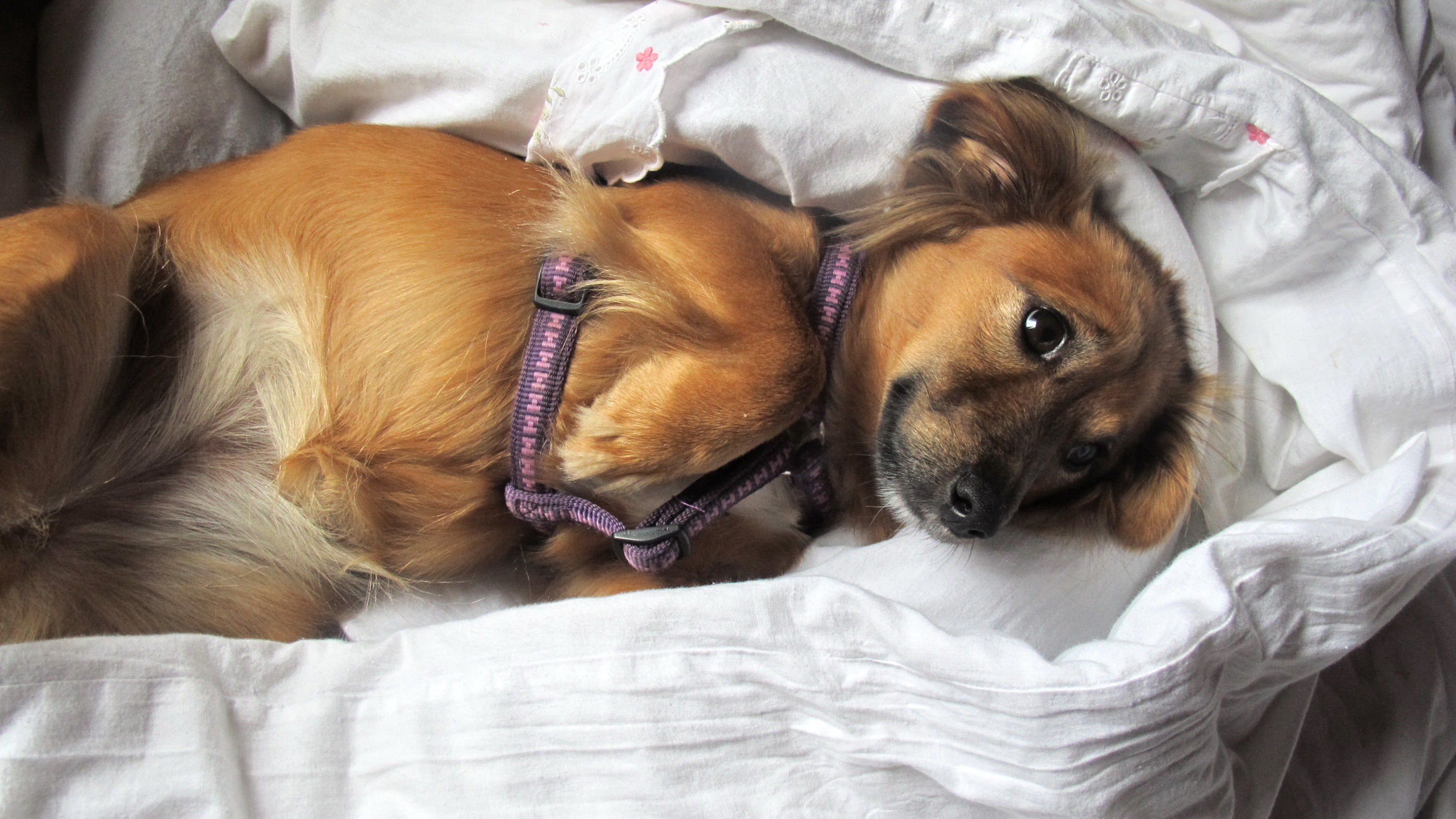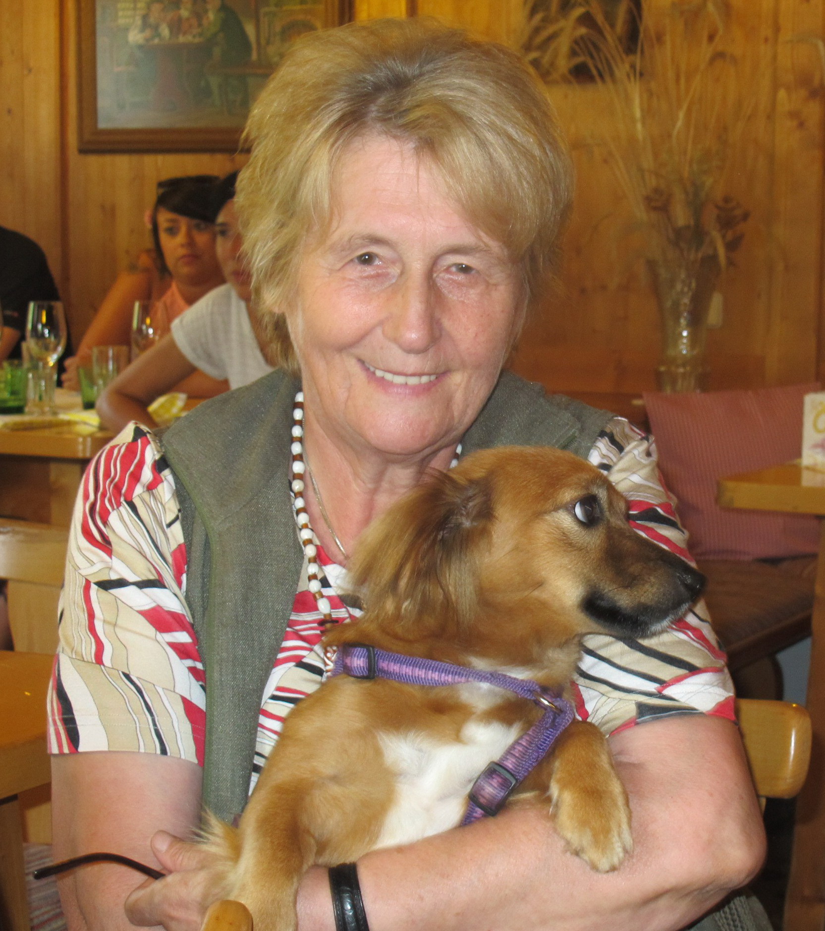 Meine Tochter ist mit ihrer Familie in ein eigenes Haus gezogen, sie kommen aber oft zu mir, auch ihr Hund, der sich jedesmal sehr freut hier zu sein. Nelly und Penny verstehen sich gut, sie toben oft gemeinsam durch den Garten. Wenn einer hinausgeht, wartet er meist auf der Terrasse, bis der zweite auch kommt. In der Wohnung verhalten sich beide sehr ruhig und brav. Nelly liegt in ihrem Bettchen oder bei mir im Bett, wo sie es dann sehr genießt, von mir beschmust zu werden. Bei Spaziergängen darf sie auch schon öfters freilaufen, was sie sehr genießt, sie macht aber noch ziemlich große Bögen, kommt aber immer bald zurück.Ich kann sie aber nur freilaufen lassen, wenn keine Hühner in der Nähe sind, denen rupft sie sonst leider die Federn aus. Sie hat schon einen ziemlichen Jagdtrieb. Da muss ich halt aufpassen. Derzeit liegt sie neben mir auf der Bank. Ich bin sehr glücklich, dass ich dieses süße Hündchen bekommen habe und danke Ihnen nochmals dafür. Sie macht mein Leben reicher und ich glaube, Nelly ist auch glücklich, bei mir sein zu können.