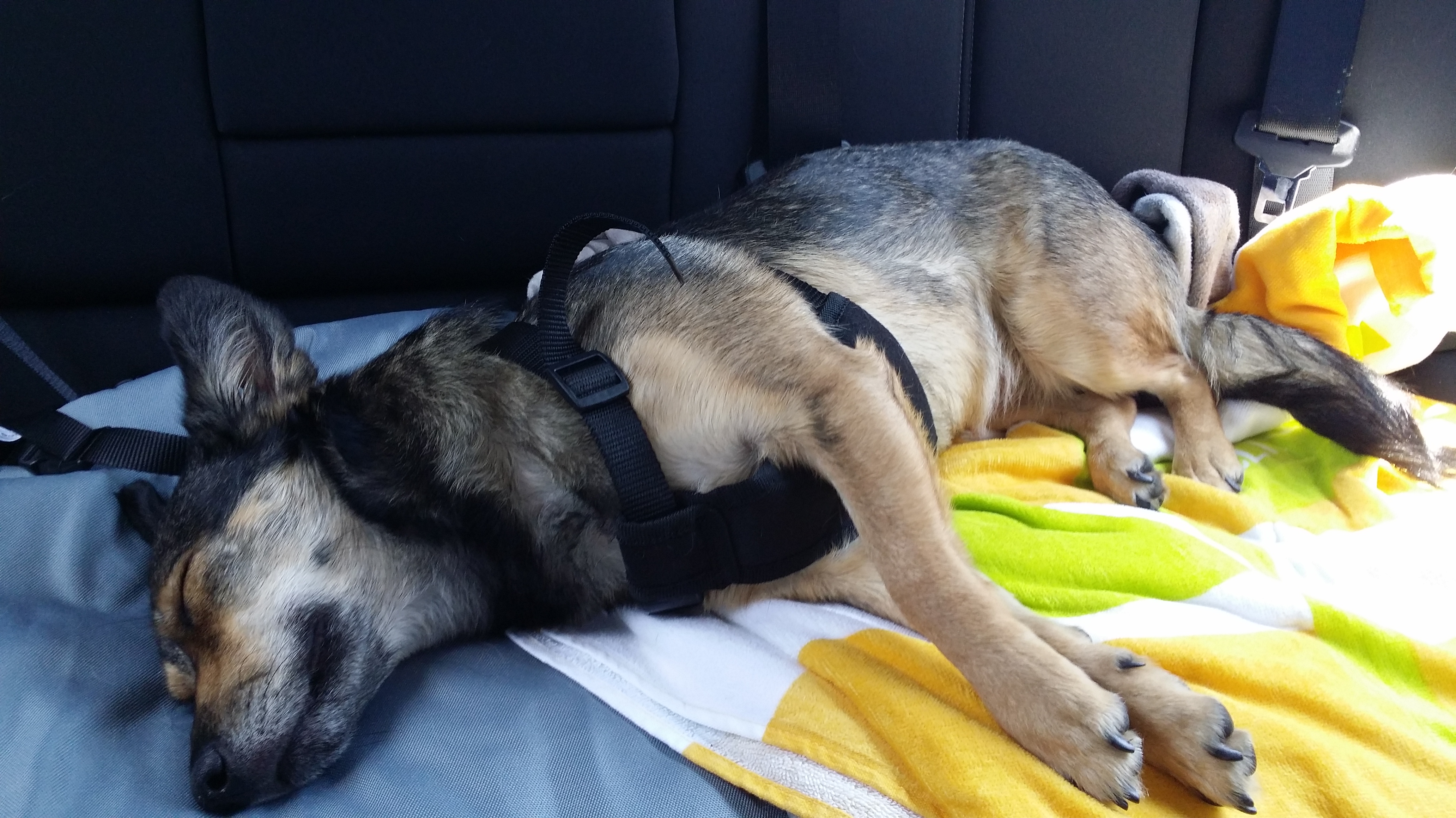 Ich war sogar schon auf einer richtigen Tour dabei! Autofahren ist ja soooooooo langweilig... Aber mir wurscht- solange ich die Stimmen von Frauli und Herrli höre, penn ich einfach auf der Rückbank ein... Wir waren in der schönen Steiermark und da habe ich ganz viele neue Düfte riechen können! Nur vor größeren Menschenmengen hab' ich noch ein bisserl Schiss. Frauli hat allen verboten, einfach nach mir zu greifen. Die ist da wie eine Bulldogge! ;) Sorgt immer dafür, dass mich neue Menschen in Ruhe lassen, damit ich erstmal schnuppern kann. Abends bin ich dann mit dem Kopf auf dem Tisch gelegen, weil ich sooooo müde war!