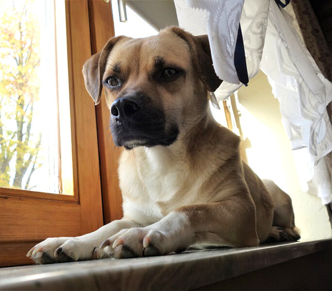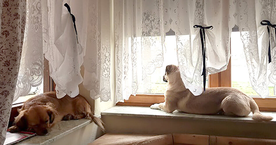 Beim Heimkommen am 22.9. lief es eigentlich optimal: Wir stellten die Transportbox in unsere Wohnküche und entfernten die Tür. Wir dachten, dass sie bis zur Eingewöhnung sein Schlafplatz sein würde. Weit gefehlt: er sprang heraus, drehte eine Runde in der Küche, sprang über die Bank auf das Fensterbrett und versuchte zu flüchten, was natürlich nicht ging. Er sprang dann unter den Küchentisch in die "Indoor-Hundehütte", die ihm zugedacht war, und blieb dort.