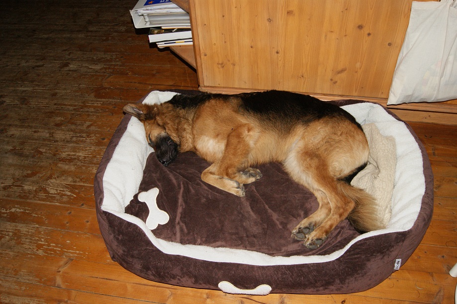 Derzeit machen wir zweimal täglich ausgedehnte Spaziergänge an der langen Leine und Spiele mit Odett. Dazu kommt das Spielen mit Ruby im Garten. Das alles ermüdet sie derzeit noch sehr. Die Hundeschule werden wir dann aber demnächst beginnen.