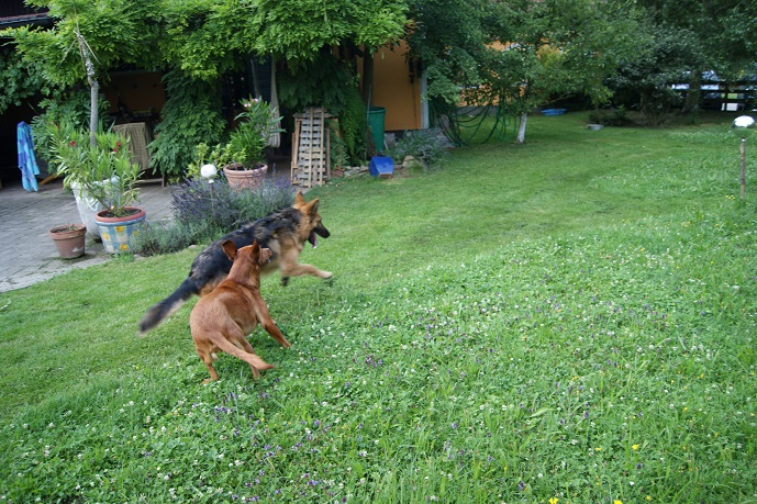 Sie hat sich super eingelebt, man sieht richtig, dass sie sich wohl fühlt. Odett hat „ihre“ Plätze im Haus und auf der Terrasse zum Schlafen und Relaxen gefunden und spielt bereits – recht ausgelassen – mit Ruby. Dabei fordert Ruby zum Spielen auf, und dann geht es so richtig los ;-) – kein Vergleich zu den eher sanften Spielen mit Peron… also recht wild, dass Peron „einschreiten“ muss: Er beobachtet das Geschehen zunächst ganz gelassen, aber wenn es ihm zu wild wird, geht er zu den zwei Damen hin und brummelt. Das zeigt enorme Wirkung – Ruhe kehrt ein! Peron hat nun auch eine neue Rolle als Vorbild und Rudelführer für die zwei Damen;-)