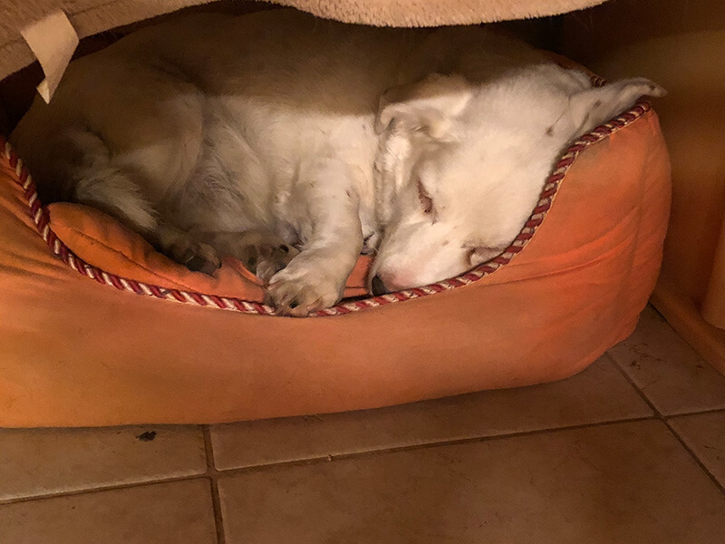 Mittlerweile bin ich schon schwerhörig und sehe schlecht und leider werden meine Spaziergänge immer kürzer, aber ich genieße die vielen Körberl im Haus (in dem orangenen liege ich am Liebsten) und wenn die Türe offen ist, dann liege ich in der Tür und kann draussen alles beobachten.