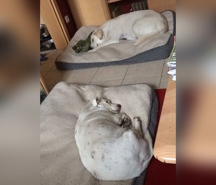 Es hat zwar über 2 Jahre gedauert, bis ich mich zu meinem Herrchen gelegt habe (ich habe ja immer noch Angst vor Männern), aber in der Zwischenzeit genieße ich es, mich abends auf der Couch zu ihm zu knuddeln.