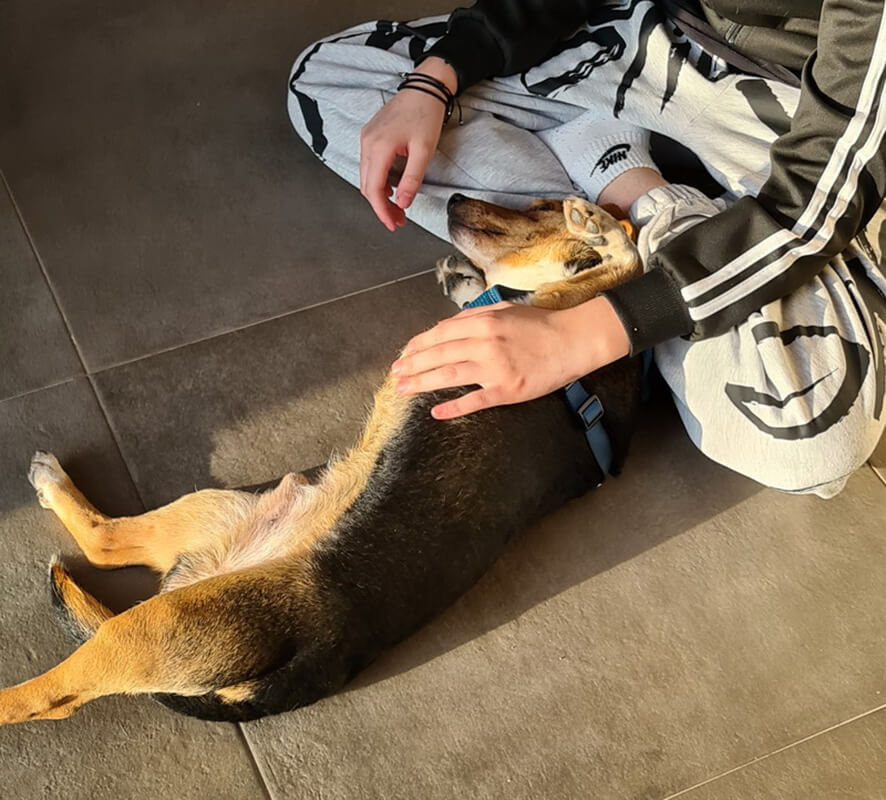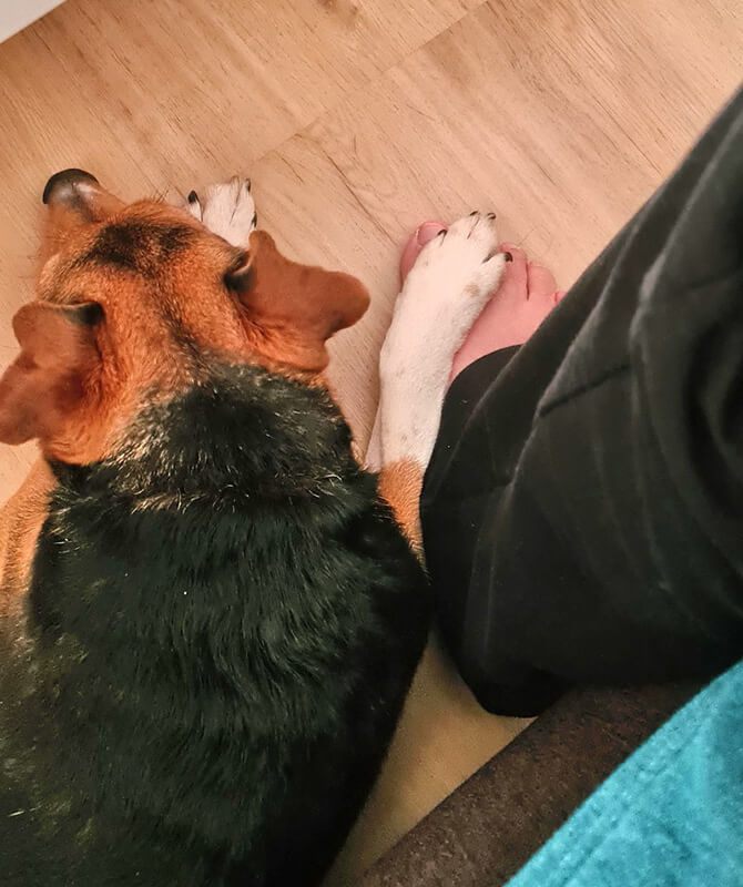 Derzeit ist er wohl noch unsicher, ob er wirklich bleiben darf, weil er an uns klebt und beim Schlafen sogar seine Pfote auf meinem Fuß legt. Das wird sich mit der Zeit legen.