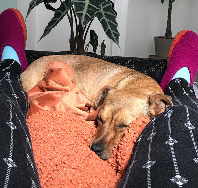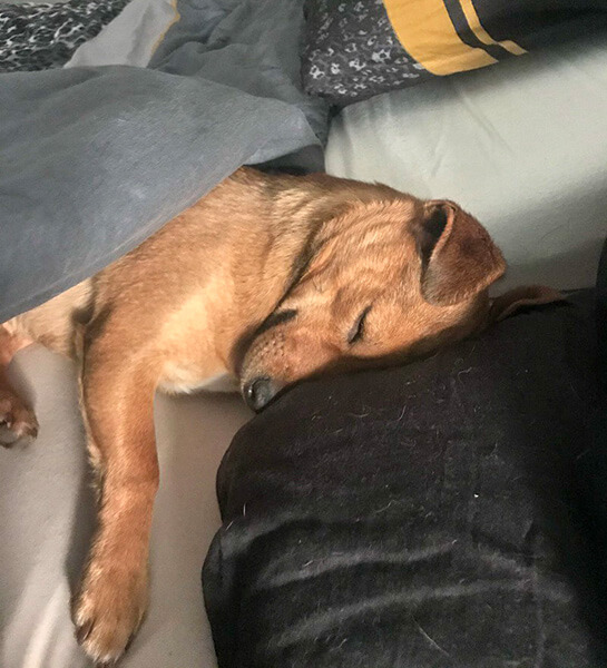 Zu Hause ist sie ganz ruhig und entspannt. Sie liebt Kauspielzeuge und auf ihrem Bett zu dösen und am Bauch gekrault zu werden.