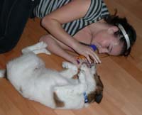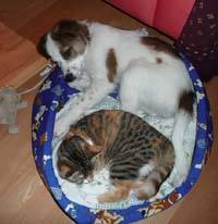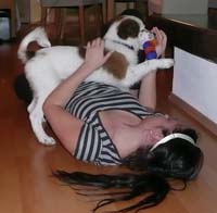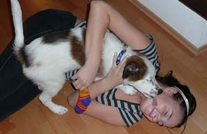Sie liebkosen, tollen aber auch oft wild herum. Er hat sie sogar gerettet, als sie in den Koffer geschlüpft ist. Mit Franziska balgt er auch oft am Boden herum.