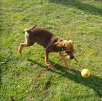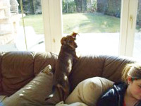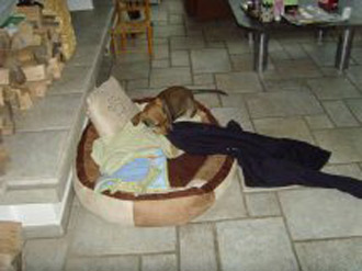 Zuhause angekommen erkundete sie das Erdgeschoß, fühlte sich gleich heimisch und suchte gar nicht nach ihrem bisherigen Rudel. Prissy legte sich kurz darauf in ihr vorbereitetes Hundenest auf die mitgenommenen Schlafplatz Tücher und akzeptierte diesen sofort, fand auch gleich an ihrer Beiß-Soff- Giraffe gefallen (Foto 2). Gefundene Objekte wurden auch gleich adoptiert (Foto 3). Damit Prissy in der Nacht nicht ganz alleine war, übernachteten wir abwechselnd im Erdgeschoß, (Fliesenboden) auf der Couch. Schon nach vier Tagen war sie stubenrein und setzt sich nun vor die Terrassentür, wenn sie mal muss. Sie genießt zwischen ihren Geschäftchen den Auslauf im Garten (Foto 4). Prissy lernt sehr schnell und ist seeehr brav in ihrer Autotransportbox, bettelt nicht wenn wir essen, winselt und jault kaum. Zur Freude unser Nachbarn hält sich das Bellen in Grenzen. Wenn wir in der Hausumgebung spazieren gehen ist sie noch an der Leine da sie genau weiß wo ihr Zuhause ist und sie sich sonst vor die Türe setzt und auf uns wartet. Auch unser Pferd hat sie schon als Familienmitglied akzeptiert und mit ihm solidarisch gegrast (Foto 5). Fernsehen in ihrem Revier (Foto 6).
