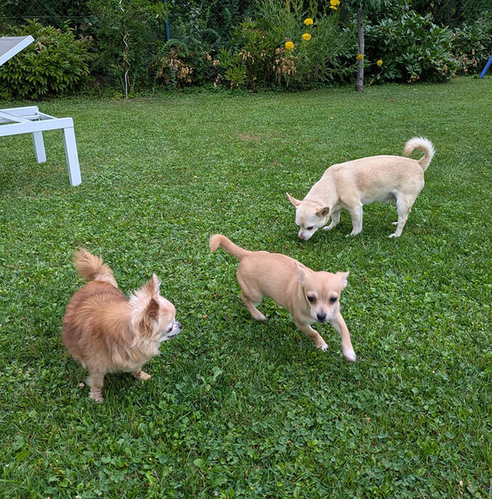 Die Hunde meiner Tochter sind öfters da und haben ihm sehr geholfen zur Ruhe zu kommen, er versteht sich toll mit ihnen auch wenn er die Oldies ein bisschen nervt mit seiner Spielfreude.
