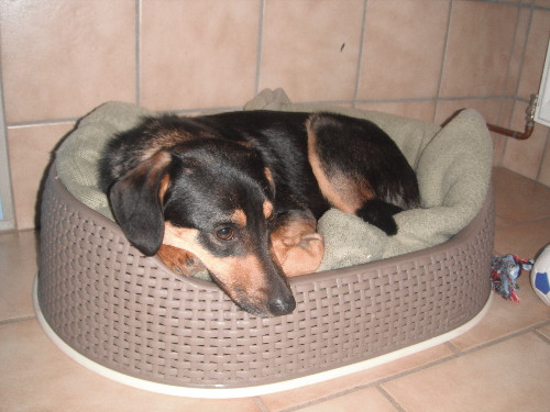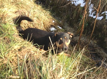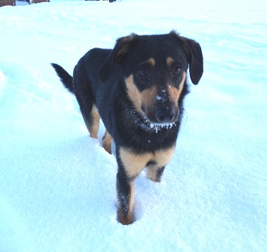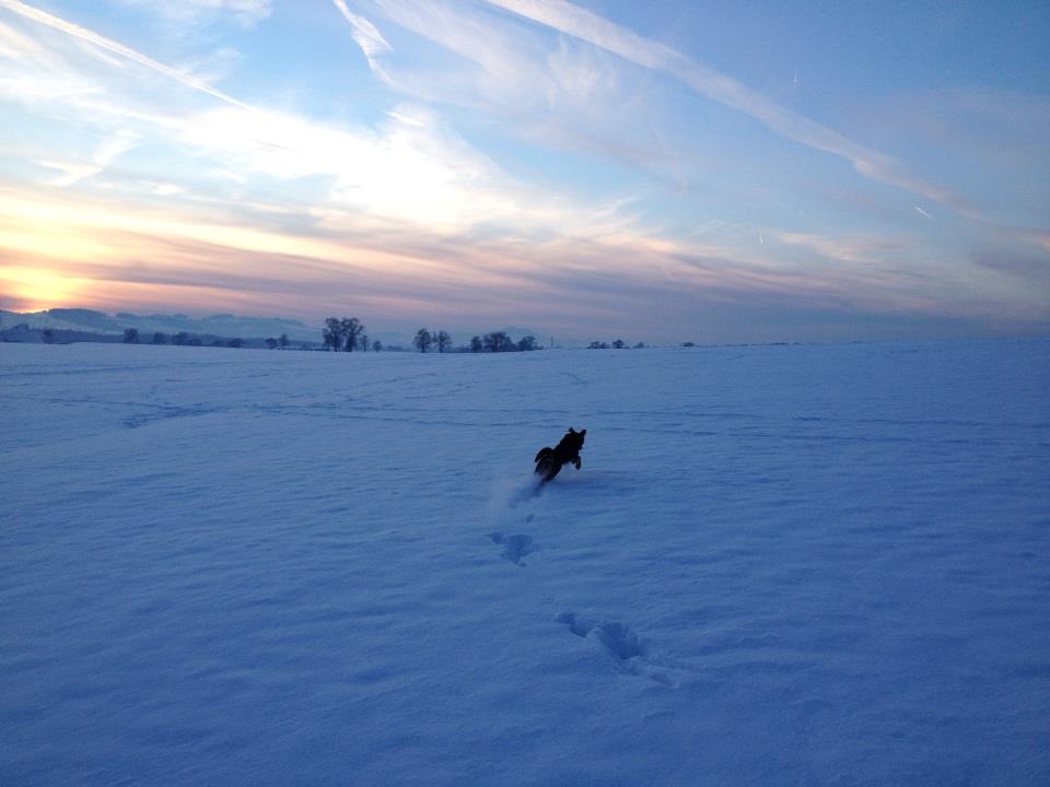 heute wird Rajta ein Jahr alt und wir freuen uns, Ihnen von unserer gemeinsamen Happy Story zu berichten. Rajta ist nach ihrer anfänglichen Schüchternheit wirklich aufgeblüht und genießt es, mit jedem von uns ihren sehr abwechslungsreichen Alltag zu verbringen. An die Tiere am Hof hat sie sich gut gewöhnt und begleitet uns bei der täglichen Arbeit. Auch das "Nebeneinanderleben" mit den Katzen funktioniert mittlerweile ganz gut. Rajta liebt es, im Heu zu spielen und auf den schneebedeckten Wiesen herumzufetzen. Auf dem Foto sehen Sie, dass sie ziemlich flink unterwegs ist. Seit Weihnachten besuchen wir regelmäßig die Hundeschule und manchmal schaffen wir auch trotz Rajta's Dackel-Dickschädel das zu machen, was die Trainerin von uns sehen will ...