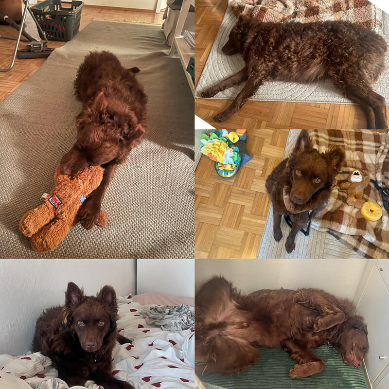 Er war von Tag 1 an stubenrein und insgesamt unglaublich unkompliziert. Mit jedem Tag wird er sicherer, er geht ganz brav an der Leine, bellt andere Hunde nie an und spielt sehr gern Fang mit mir, wenn keine anderen Hunde zum Spielen dabei sind. Er ist noch ein bisschen schüchtern gegenüber Artgenossen und unsicher bei Männern, aber das sind Dinge, an denen wir gut arbeiten können. Außerdem ist er ein richtiger Mähdrescher – er nimmt jedes Leckerchen begeistert an – und hat heute sogar mein Bett okkupiert. Er wird von jedem bewundert und ich kann stolz erzählen, dass er aus einem Tierheim kommt.