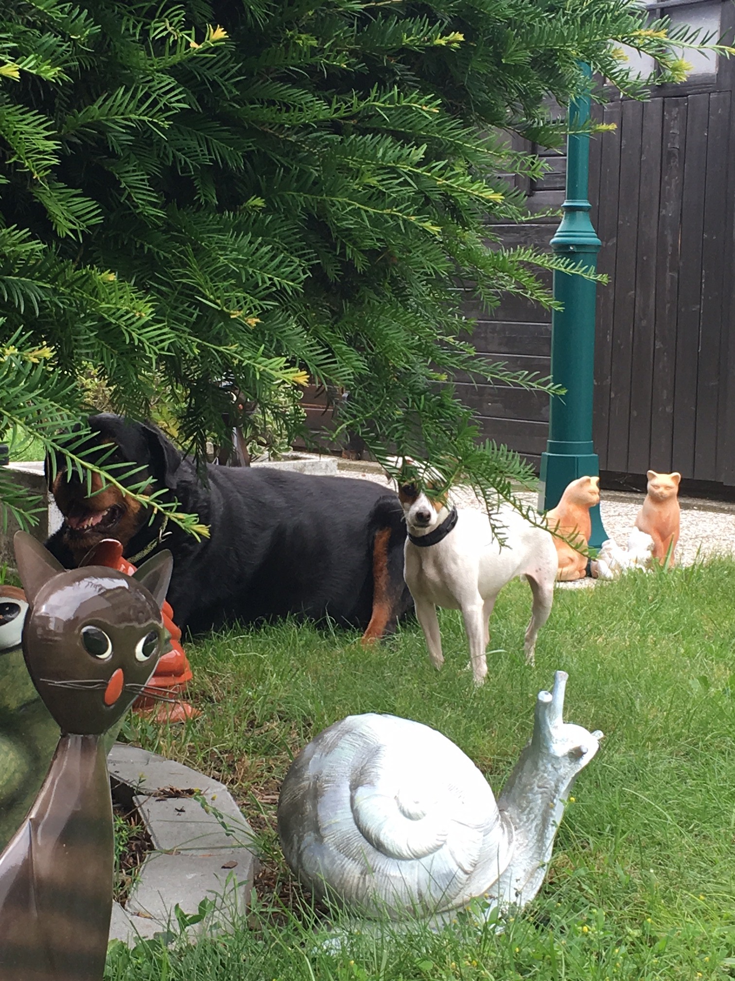 Mit unseren zwei großen kommt sie gut klar (fotos anbei), bei dem einen ist sie sogar schon der Chef da sie ihm klar gemacht hat – bis hier her und nicht weiter :) Sie läuft den zweien richtig nach und schaut was sie tun und warum sie das tun – neugierig ist sie sehr! Sie hat den Garten schon komplett untersucht und sobald was neues wo steht wird das auch kontrolliert – sehr sehr neugierig – nur das erschrockene legt sie schwer ab. Aber wer weis was der kleinen alles wiederfahren ist – wir kriegen das schon hin!