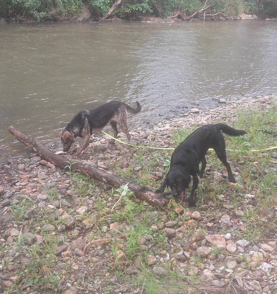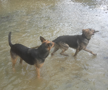 Auch was die Liebe zum kühlen Nass und das Aportieren von Stöcken angeht sind sich die beiden einig...