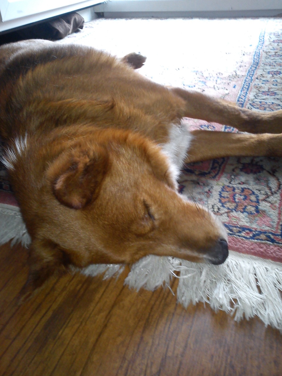 Ein Stück weit hat er sogar schon verstanden, wie das mit der Leine funktioniert und wann er auch mal mit einer kürzeren Leine auskommen muss. Er hört schon auf "Stopp" und "weiter" an der Straße und begreift auch schon immer besser, was ich von ihm will, wenn ich "bleib bei mir" oder "komm" sage. Ball spielt er am liebsten mit Frederik, weil der noch etwas wilder mit ihm spielt als ich. Andere Hunde, Spaziergänger und Freunde will er immer direkt beschnüffeln und mit ihnen spielen oder im Falle von Menschen gestreichelt werden. Natürlich kommen von Kindern oder anderen oft Kommentare wie "der sieht ja aus wie ein Fuchs" oder "ooooh, ist der süß / knuffig / niedlich / lieb". Auch die Tierärztin hat ihn ganz doll gelobt. (ich glaube, ich muss aufpassen, dass er nicht überheblich wird ;-) ) Er genießt die ganze Aufmerksamkeit total, ist aber auch froh, wenn wir wieder zuhause sind und haut sich dann wieder auf den Teppich oder auf das Sofa, bzw. fällt einfach da um, wo ich gerade bin. Er kuschelt sich auch total gern an einen ran (auf dem Sofa) oder stellt einen wärmenden Pantoffelersatz für die Füße dar.