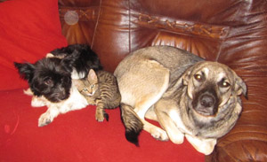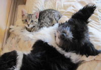 Sarah und Terry haben übrigens unser Findelkatzenbaby Daisy adoptiert - unglaublich. Auf einem der Foto sehen Sie Terry und Daisy sowie Sarah, Terry mit Daisy in der Mitte auf der Couch. Man beachte bitte auch den wunderschönen Wuschelschwanz von Terry. Ein Foto zeigt Terry, wie sich noch ein ganz dünnes Mäuschen ist.