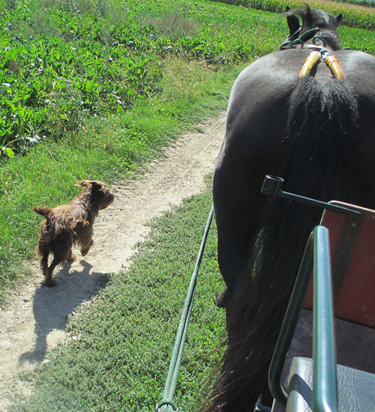 So lange schon wollte ich mich mal melden und Danke!!!! sagen. Danke für Tina, das braune Schnauzermix-Mädchen, das ich im Dezember 2018 in der Steiermark geholt habe. Tini ist ein absoluter Goldschatz. Sie ist verschmust, mit allen Hunden und sowieso allen Menschen verträglich, behütet und beschützt unsere beiden Katerchen und hat mittlerweile auch Autofahren ganz gut gelernt. Sie ist ein super Reit- und Kutschenbegleithund und daheim so etwas von unheimlich brav, daß sie einen Heiligenschein verdient hätte :))) Auf den Fotos läuft sie neben der Kutsche her bzw. kuschelt mich nieder bei uns im Garten.