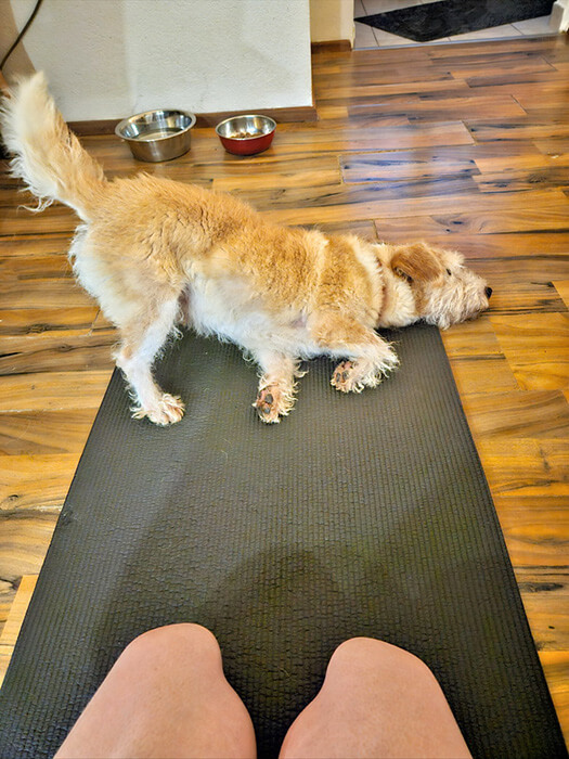 Ich schick noch eine Foto von seinem neuen Hobby - er unterstützt mich gerne beim Yoga machen.
