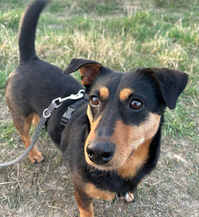 Wir üben täglich mit viel Geduld und Leckerlies verschiedene Dinge wie Maulkorbtragen oder Alleinebleiben.