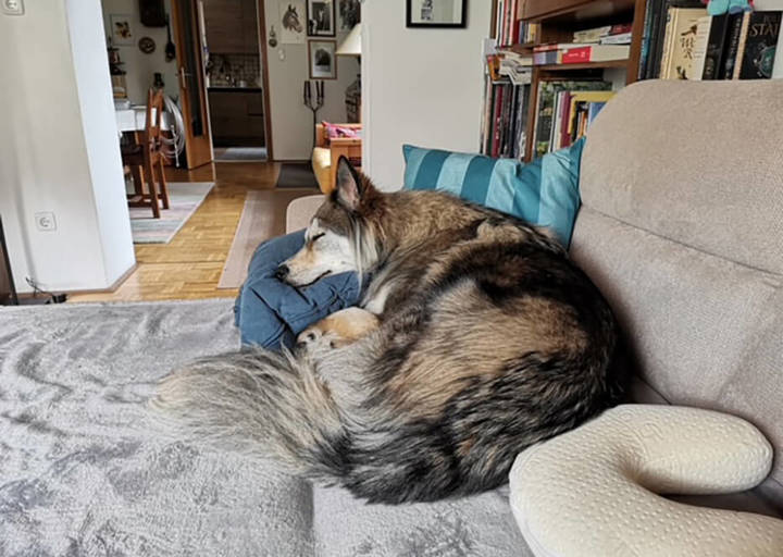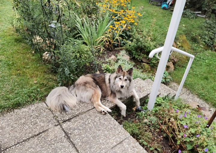 Überhaupt haben wir hauptsächlich Fotos, auf denen der kleine Wolf irgendwo herumliegt. 😅 Diesen Bildern voraus gehen aber oft lange Spaziergänge oder eine wilde Jagd durch den Garten 😉