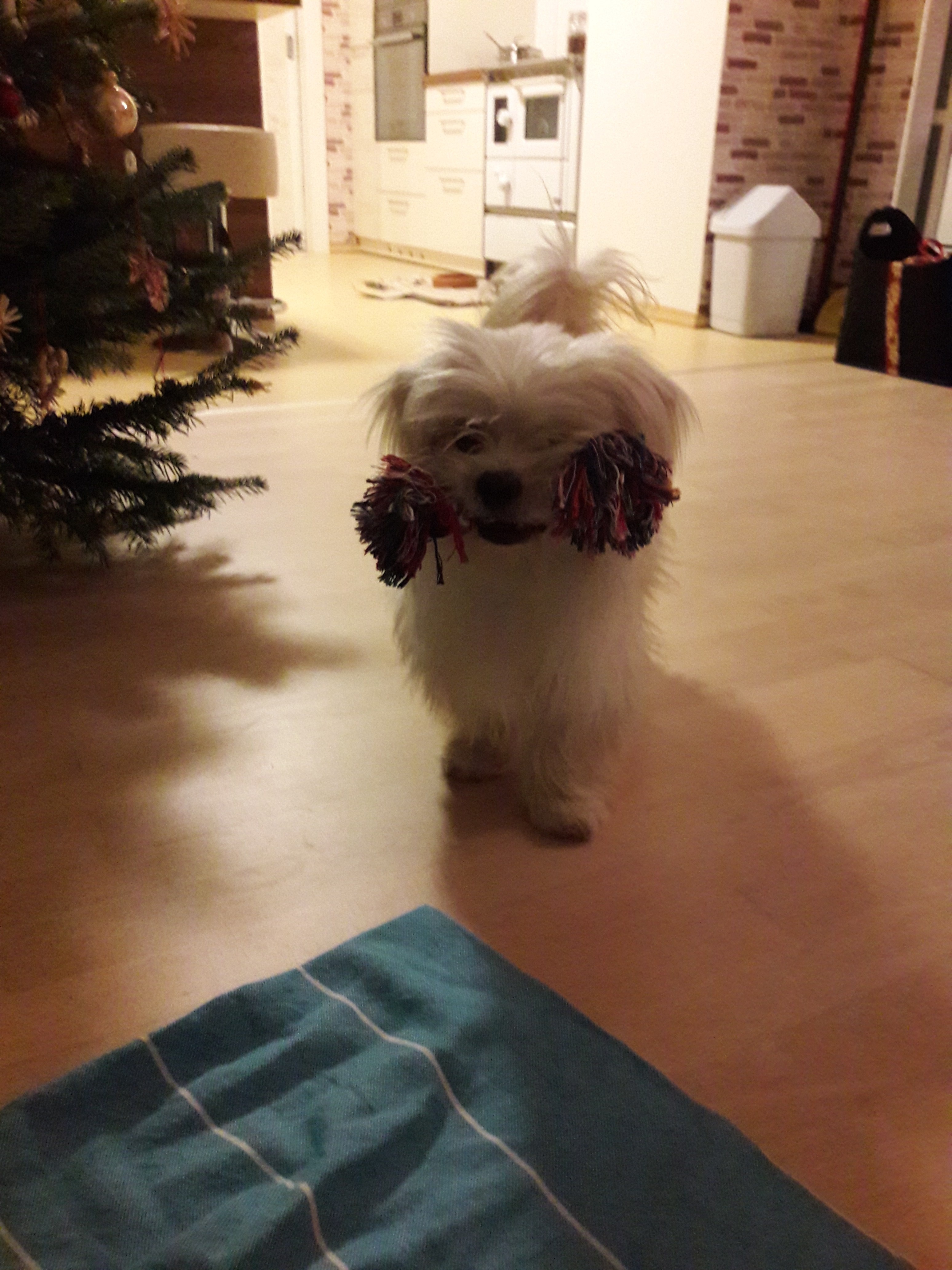 Hier habe ich ein paar Fotos von Vincent rausgesucht. Wir haben schon so viele Fotos von ihm! Er spielt sehr gerne mit dem Seil und bringt es gerne zurück. Der Platz beim Christbaum ist sein Lieblingsplatz. Schlafen tut er neben unserem Bett auf einem Polster. Er kommt auch wenn wir ihn rufen oder pfeifen. :)