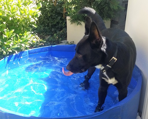 Da wir neben der Donau wohnen, kommen wir fast jeden Tag bei unseren Spaziergängen (in den Hundezonen) zu anderen Hunden und das gefällt ihm sehr. Kaum kommen wir in die Nähe von Wasser ist er schon drin – daher hat er von meiner Tochter ein Planschbecken für den Garten bekommen.