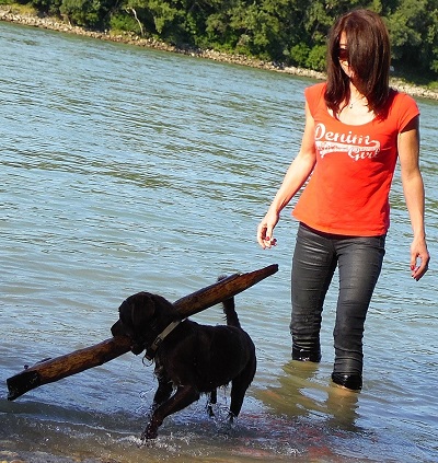 Am erstaunlichsten war für uns, dass er sich innerhalb von nur vier, fünf Tagen an U-Bahn (in den ersten beiden Tagen auf meinem Arm), Straßenverkehr und Autofahren gewöhnt hat und ausnehmend rasch stubenrein wurde, obwohl wir im Dachgeschoß wohnen und er die Liftfahrt ja quasi "zeitlich einkalkulieren" musste. Vito hat trotz seiner Jugend unglaublich schnell und verlässlich die Grundkommandos erlernt, geht - außer auf Hauptverkehrsstraßen - ohne Leine bei Fuß (natürlich sage ich ihm das Kommando noch öfter als meinem letzten Hund), stoppt auf "Steh!" beim Randstein, auch wenn er die Tauben auf der Straße wahnsinnig gerne jagen würde, und setzt sich erst auf "Geht schon" wieder in Bewegung. Er unterscheidet sein Spielzeug nach Namen (Puppi, Knochen, Bär, Ball, Ringerl usw.. ) und bringt auf Aufforderung voller Begeisterung den richtigen Gegenstand. Im Wald entfernt er sich nie aus meiner Hörweite - er ist unser dritter Hund, ich bin da natürlich gelassener als jemand, der noch nie Hundebesitzer war, bin schon am 2. Tag mit ihm leinenfrei auf den Wilhelminenberg gefahren und dachte mir, er kann sich gleich daran gewöhnen, dass nicht ich ihm, sondern er mir nachläuft - , kommt auf Pfiff, selbst wenn er mitten im Spiel ist, und letzte Woche hat er (nach langem Zögern, Wasser war ihm, trotz Hunderter in Ufernähe hingeschmissener "Holzis" zunächst gar nicht geheuer) auch schwimmen gelernt. Wir alle haben Riesenfreude an und mit ihm, meine großen Söhne (21 und 19) schleppen ihn überallhin mit, wenn es irgendwie geht, und der kleine, verspielte, anhängliche Kerl mit seinem großen Herz, seiner Quirligkeit (eben lernt er, neben meinem Rad herzulaufen, das wird allerdings noch ein wenig dauern, bis es wirklich gefahrlos klappt) und seiner gleichzeitigen Gelassenheit ist uns sehr, sehr ans Herz gewachsen.
