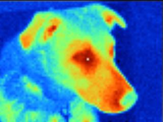 Da man die schwarzen Hunde ohne Schneehintergrund nur schwer fotografieren kann, habe ich ein Infrarotfoto mit der Wärmebildkamera gemacht.