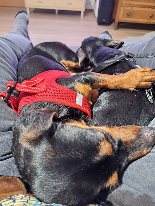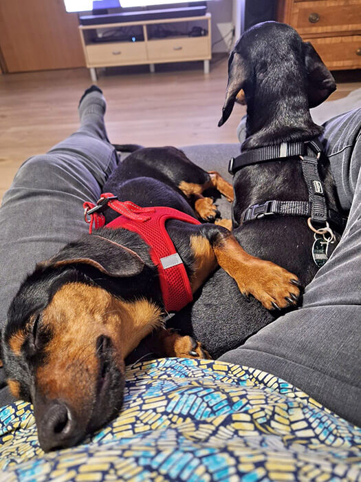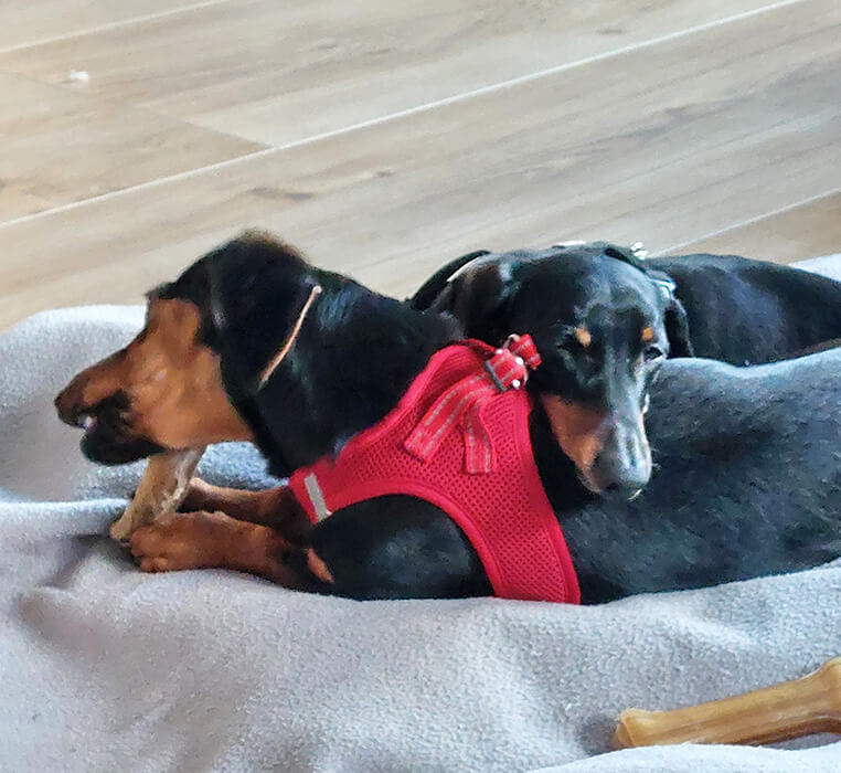 Sie sehen zwei glückliche Hunde: Wuz (Obelix) und Lotti (Kitty).