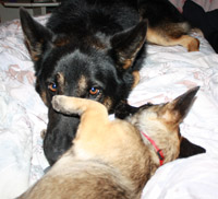 Ares und Yuna vertragen sich prächtig. Sie müssten mal sehen wie die zwei spielen - sie springt dann hoch um ihn in die Backe reinzuzwicken oder sie kneift ihn in den Schwanz oder in den Fuß. So stachelt sie ihn an um mit ihr zu spielen. Beim Spiel geht Ares sehr vorsichtig mit ihr um. Es ist einfach nur herrlich zu sehen wie ein Koloss mit einem Winzling spielt.